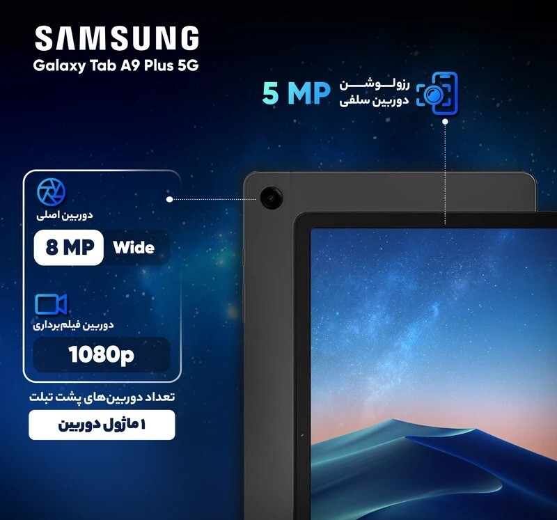 تبلت Galaxy Tab A9 Plus 5G با یک دوربین اصلی ۸ مگاپیکسلی عریض مجهز به فوکوس خودکار (AutoFocus)، امکان ثبت تصاویر روزمره با کیفیت مناسب را فراهم میکند. این دوربین در شرایط نور کافی جزئیات خوبی ارائه میدهد و برای عکسبرداری از محیطهای داخلی و بیرونی عملکرد قابل قبولی دارد، هرچند در نور کم ممکن است نویز در تصاویر کمی محسوس باشد. همچنین، دوربین اصلی قادر به فیلمبرداری Full HD با رزولوشن ۱۰۸۰×۱۹۲۰ و سرعت ۳۰ فریم بر ثانیه است که مناسب ضبط ویدئوهای کوتاه یا جلسات آنلاین میباشد. دوربین سلفی ۵ مگاپیکسلی تجربه خوبی برای تماسهای ویدیویی، کلاسهای آنلاین و کنفرانسها فراهم میکند. این دوربین از فیلمبرداری ۱۰۸۰×۱۹۲۰ با سرعت ۳۰ فریم بر ثانیه پشتیبانی میکند و تصاویر واضح و طبیعی در تماسهای تصویری ارائه میدهد. با ترکیب دوربین اصلی و سلفی، کاربران میتوانند به راحتی عکسبرداری روزمره، ضبط ویدئوهای کوتاه و تماسهای تصویری با کیفیت مناسب داشته باشند و این ویژگی در کنار صفحهنمایش ۱۱ اینچی و اسپیکرهای چهارگانه تجربه چندرسانهای خوبی ایجاد میکند.